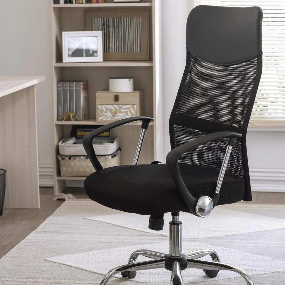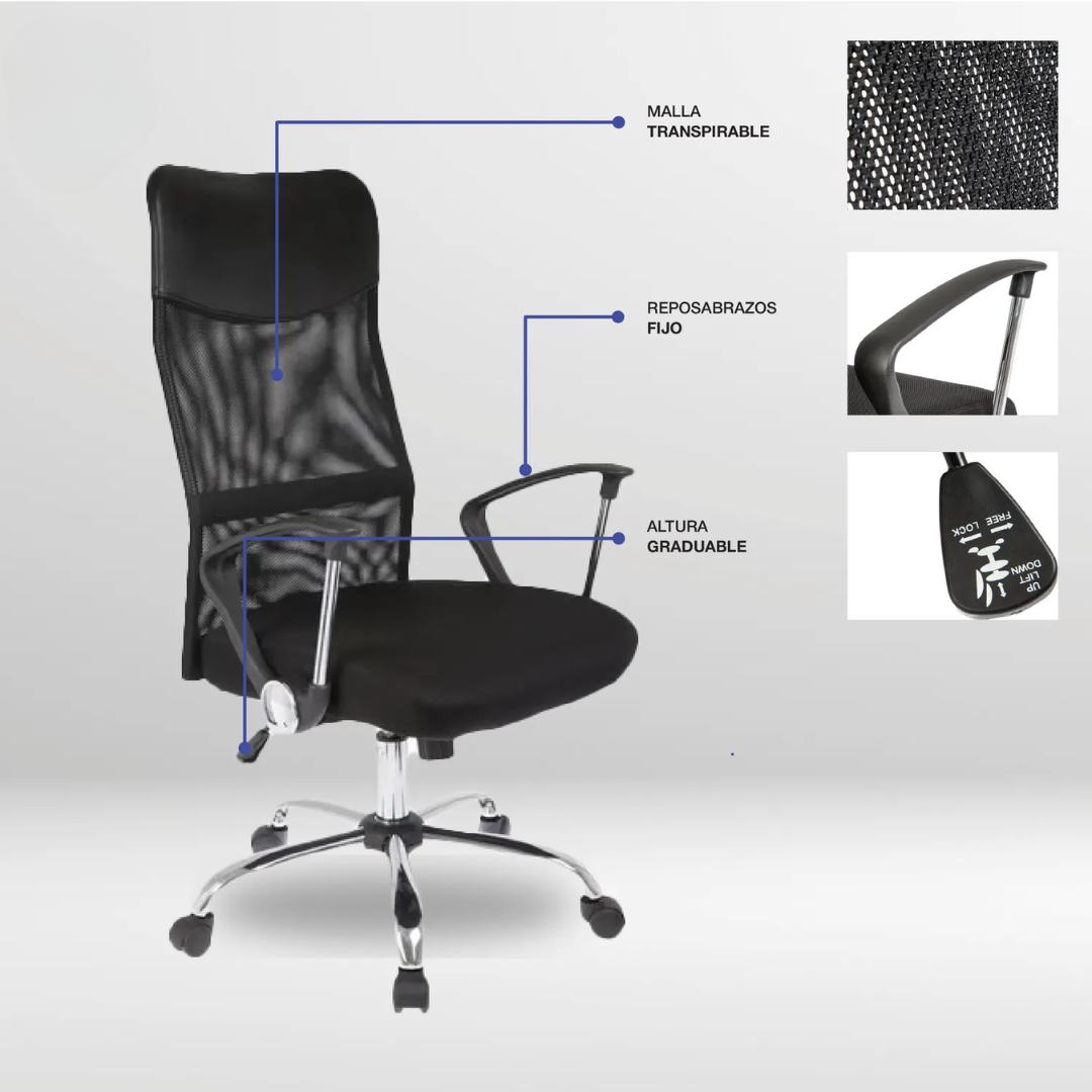 Silla ejecutiva con respaldo ergonómico de malla y brazos fijos. Combina ventilación y soporte lumbar para largas jornadas laborales. Su diseño curvo favorece la postura, ideal para estaciones de trabajo modernas.